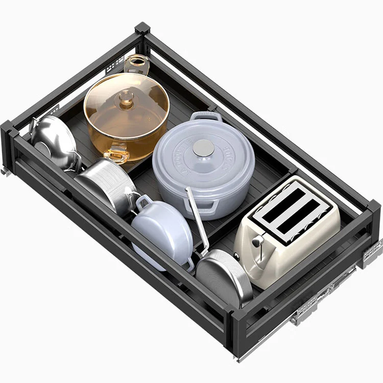 Bei diesem ausziehbaren Korb aus Aluminiumlegierung handelt es sich um ein integriertes Aufbewahrungszubehör für die Küche, das hauptsächlich für die klassifizierte Aufbewahrung von Küchenutensilien wie Geschirr, Töpfen und Gewürzen verwendet wird. Diese Küchenschrankschublade ist eine speziell entwickelte integrierte Aufbewahrungslösung für moderne Küchen. Mit einem mehrschichtigen Design und praktischen Funktionen im Kern löst es problemlos die Probleme der unordentlichen internen Aufbewahrung und der geringen Platzausnutzung in den Schränken und ist ein hervorragender Helfer für die Aufbewahrung in der Küche.